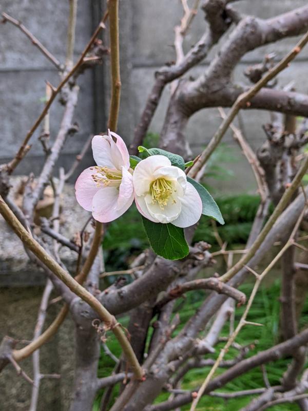 この厳寒の中 ヒーリングゆうの庭の木瓜に花が咲きました。