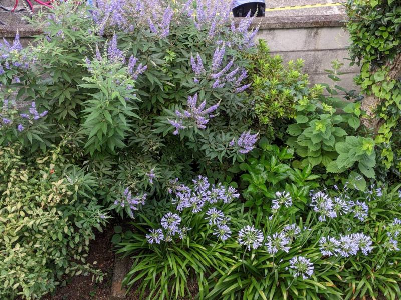 二階ベランダからの眺めです。アガパンサスと西洋ニンジンボク。